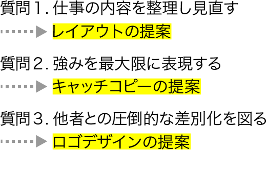 『どうしたら集客できるのか?』 と考えを巡らせている方にはヒアリング(聞き役)が有効です。集客に必要な3つのポイントを押さえた質問と回答に沿ったデザインを提案いたします。