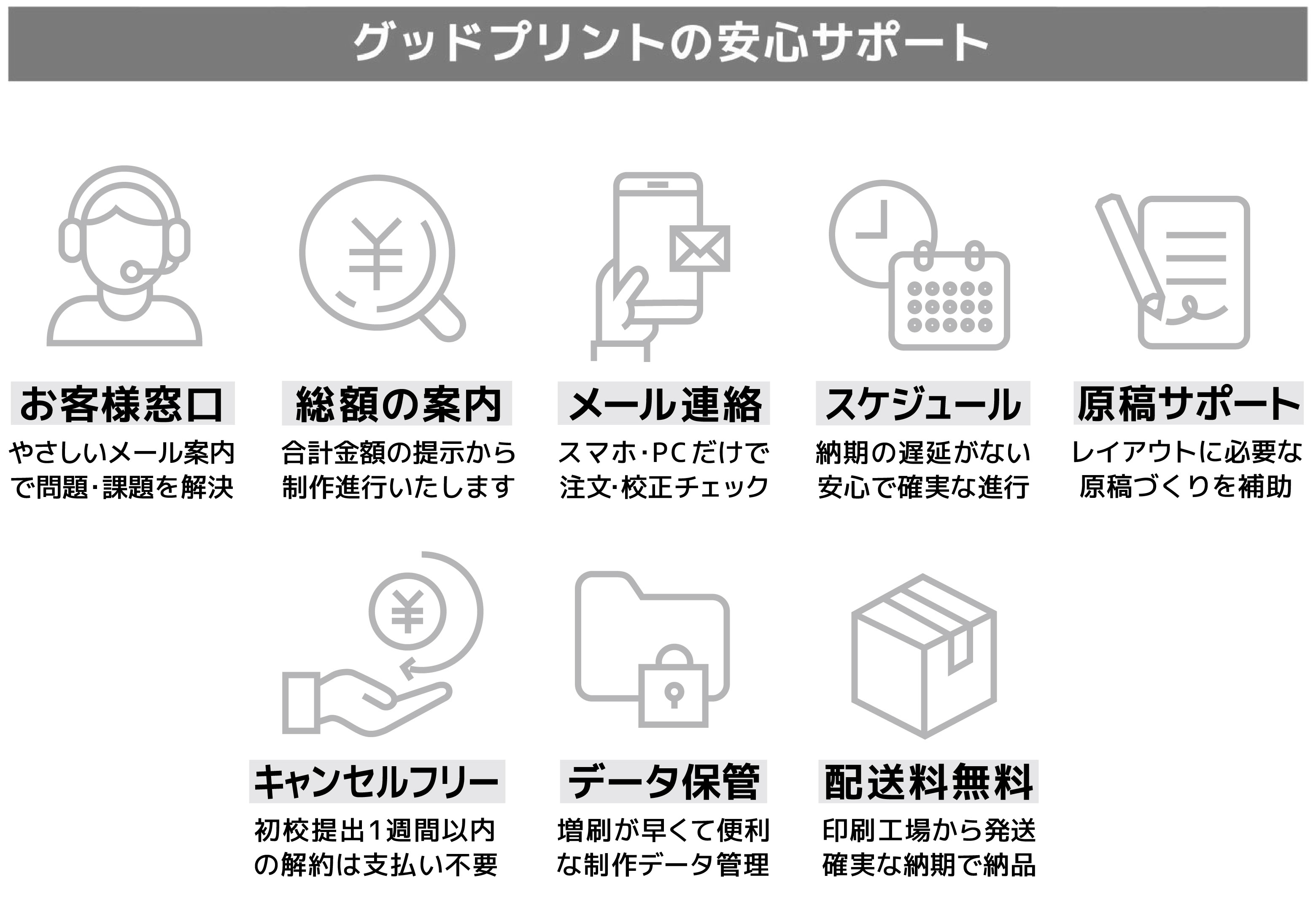 グッドプリントは、厳選された高品質を誇るネット印刷への入稿・発送手配をあなたに代わって行います。徹底した進行スケジュール・管理体制のもと納品まで見届けます。納期に遅れる心配はありません。洗練されたDTP環境をコンビニに立ち寄る感覚で気軽にご利用いただけます。